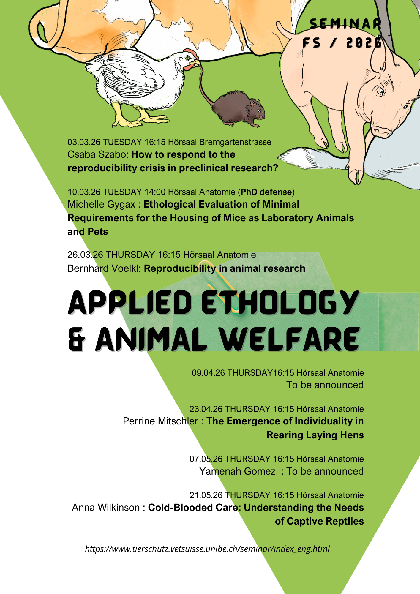 Our bi-weekly seminar provides opportunities for students and postdocs of our group as well as for external students of applied ethology and animal welfare to present and discuss their latest research ideas and findings. The seminar also includes topical presentations by PhD students, and about every other month we host an invited guest speaker from around the world. Everybody interested in applied ethology and animal welfare research is welcome to attend.